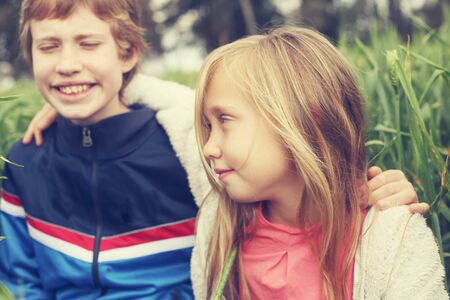 Portrait of sister with her autistic brother enjoying freedom and summer. Ending coronavirus quarantine, out of covid-19 quarantine.