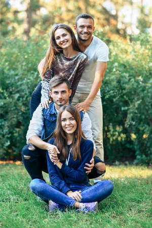 Men and women on nature. Four happy friends smiling and looking at camera. Young girls and guys sitting and standing on grass. Portrait of cheerful people in nice weather