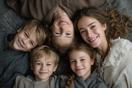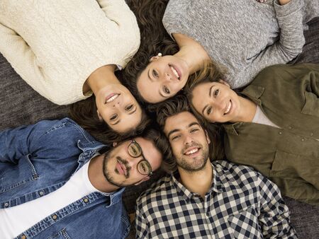 Top view of a group of friends lying on floor and looking at camera