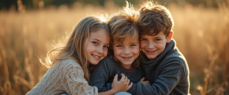 Three cheerful children, two boys and a girl, are huddled together in a golden field, their smiles radiating warmth and joy. The soft sunlight bathes them in a magical glow, highlighting their playful expressions and the carefree spirit of childhood, creating a heartwarming scene of love and connection.
