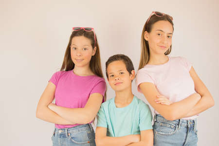 Back to back besties. A cute brother and sister standing isolated on grey.