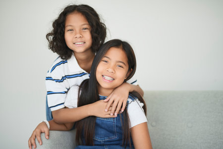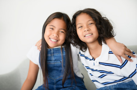 two 9 years thailand twin sit on sofa at home