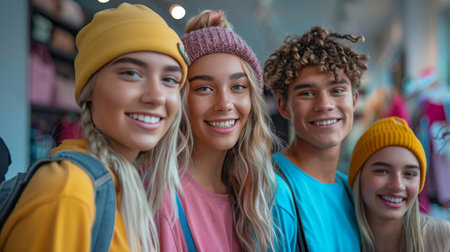 Young, Diverse Teenage Friends Smiling in Colorful Casual Wear Indoors. Education. studying and typical of university life concept. Generative ai.