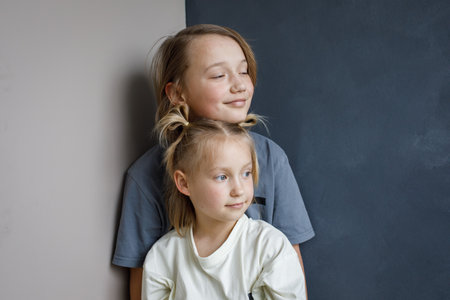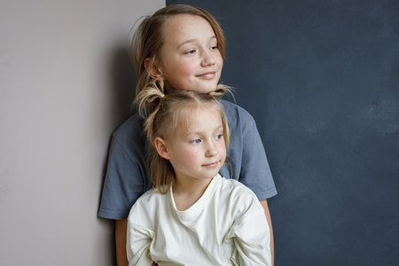 Lovely young sister and brother hugging indoor. Sibling children together portrait