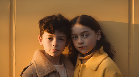 portrait of little girl and boy looking at camera on yellow background