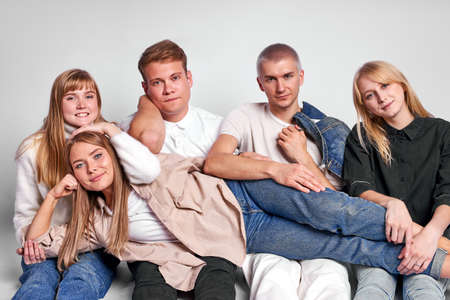 portrait of friendly caucasian guys and ladies sitting on the floor in studio, young people enjoy being together, look at camera, pleasant, wearing casual clothes