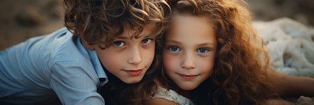 Two children with curly hair enjoy a playful moment together at the beach. The sun sets behind them, casting a warm glow on their happy faces as they lean close, sharing smiles.