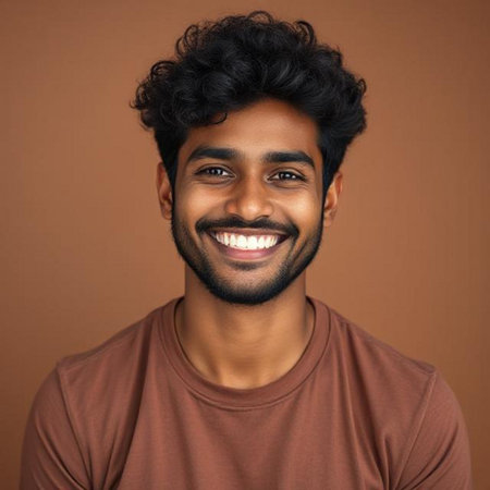 Portrait of a happy young Indian man smiling against brown background