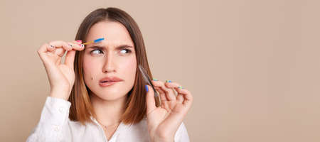 Indoor shot of puzzled confused woman in white shirt standing with eyebrow brush and tweezers in hands, looking away at copy space for advertisement or promotional text.