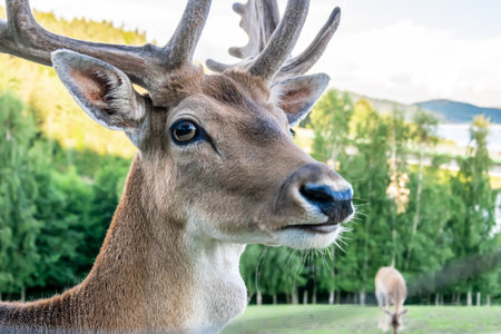 Male European fallow deer in the meadow. Close-up