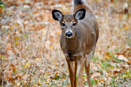 White-tailed doe (Odocoileus virginianus) alert and looking for danger in the forest during autumn. Selective focus, background blur and foreground blur.