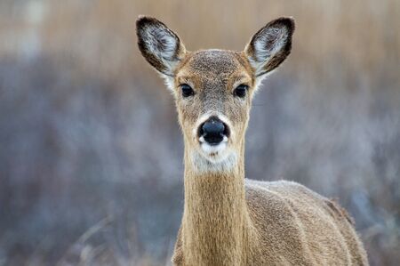 White-tailed deer, doe (odocoileus virginianus) standing in a Wisconsin field in January, horizontal