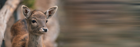 The red deer (Cervus elaphus) babyies walking in the forest. Trees and dry forest in background. Evening sun. Portrait.