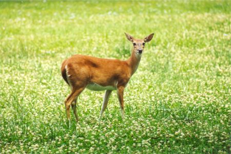Shot of a deer posing in front of the camera. Selective focus, natural light.