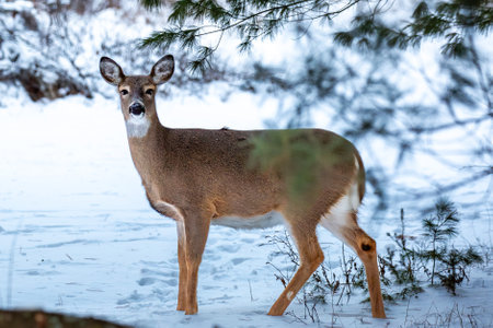 Deer standing on snow-covered ground in a winter forest during sunset. Concept of wildlife, nature, winter season, animals in their natural habitat.