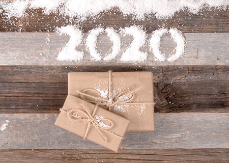 Happy New Year 2020 holiday. Christmas decoration and gifts. Background with 2020 snow figures