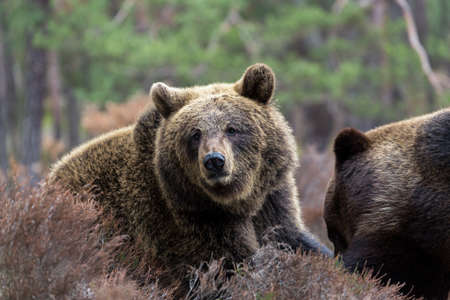 Close-up two brown bears in autumn forest. Danger animal in nature habitat. Big mammal. Wildlife scene