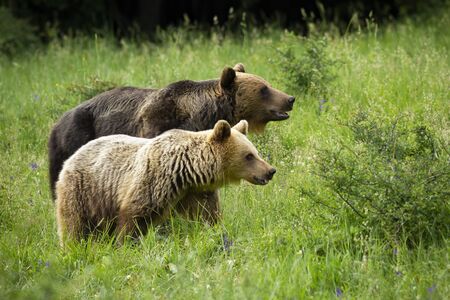 Couple of brown bear, ursus arctos, in courtship on meadow in green summer nature. Pair of female and male mammal walking on grass together in mating season.
