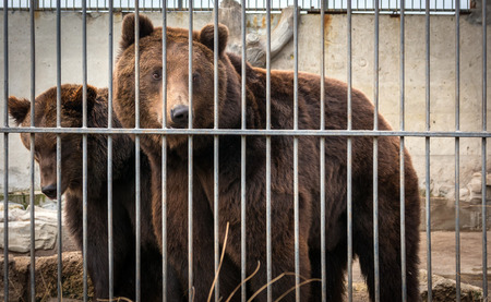 Big upset brown bear in capture of zoo cage looking at camera through metal bars in gloomy day