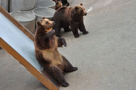 Brown bear sitting in a zoo. Brown bear in a funny pose.