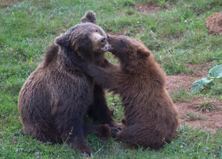 Brown Bears growl at each other while appearing to play and bond in partnership
