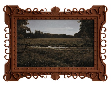 wide dark brown carved wooden picture frame with cutout canvas on yellow wall