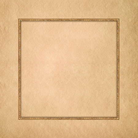 Golden painted frame with repeating abstract elements on sandstone color wall.