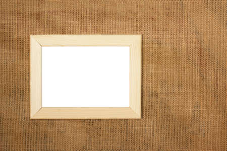 Empty wooden frame on the background of burlap. Place for text. The concept of ecological, natural materials, country life, simplicity