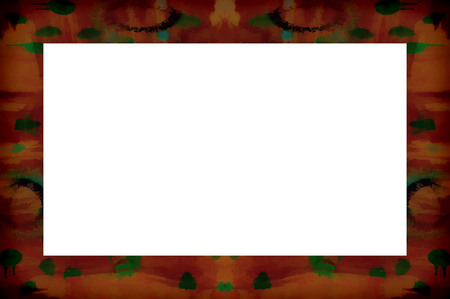 Empty wooden frame on multi-colored abstract paper background. Top view. Copy space. Selective focus.