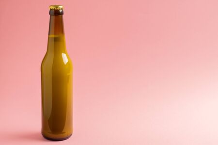 Bottle of cold beer on color background