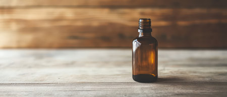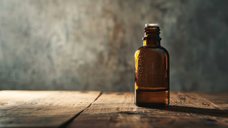 A brown glass bottle sits on a rustic wooden table illuminated by soft natural light creating a warm and inviting atmosphere.