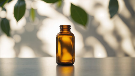 Brown glass bottle stands on a table with soft lighting and natural shadows in a tranquil indoor setting