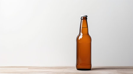 The image features a single brown beer bottle on a wooden table with a white background. The bottle is centered and slightly tilted, illuminated by natural light for a warm atmosphere.