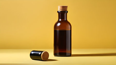 A brown glass bottle with a cork stopper, perfect for essential oils or medicine, set against a vibrant yellow background in a studio shot.