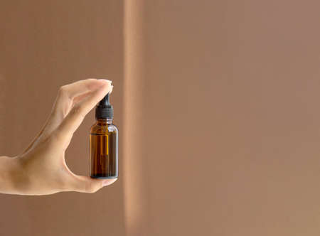 Mockup of dropper bottle is located between two fingers of woman's hand on brown background. Close-up, copy space. Concept of body care, cosmetology.