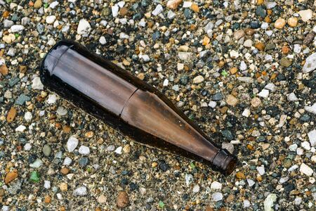 whole and broken brown bottles are scattered on the gravel.Concept: waste recycling, disposal of garbage