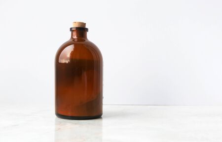 Amber glass bottle with cork on white surface