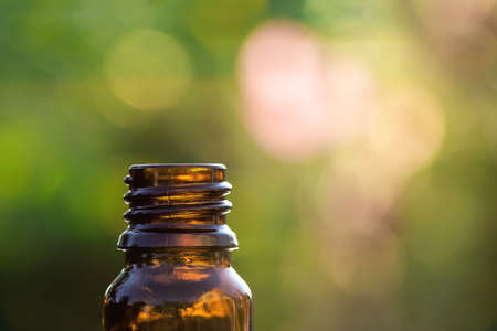Closeup of dark glass bottle on natural background, macro. Essential aromatherapy concept