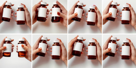 This image features hands holding amber-colored medicine bottles with blank labels, set against a white background. It is ideal for medical, pharmaceutical, or product branding use.