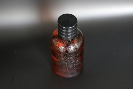 Red color glass perfume bottle without label or sticker in a black background