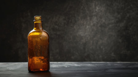 Empty glass bottle on the table against black background with copy space.