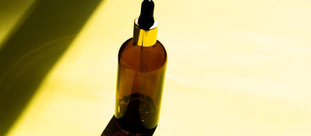 Open amber bottle with serum or essential oil. White background with daylight and beautiful shadows. Beauty concept for face and body care