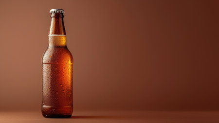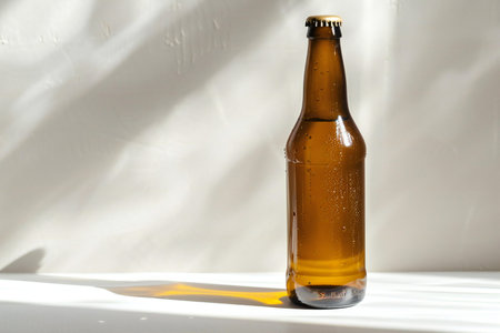 Brown glass bottle with blank label standing on white tiled surface against neutral background with water droplets on exterior.