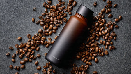 Mockup of black cosmetic bottle on coffee beans background, top view