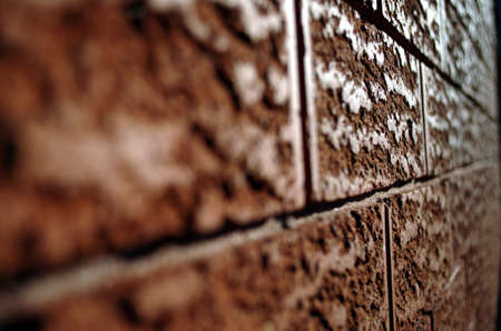 Close-up of a brick wall with black spots. Overlay for your design with the ability to copy. Abstract weathered texture stained with aged paint, rough rusty masonry blocks. High quality photo