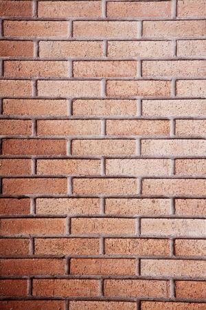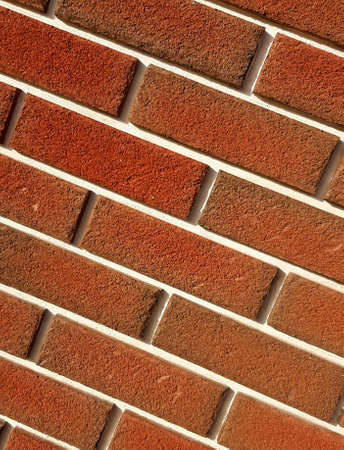 Red brick wall with white seams, beveled at corner. Carmine textured brickwork