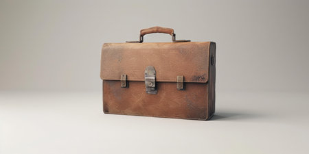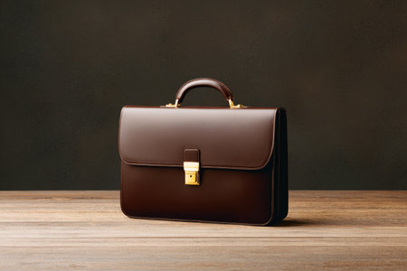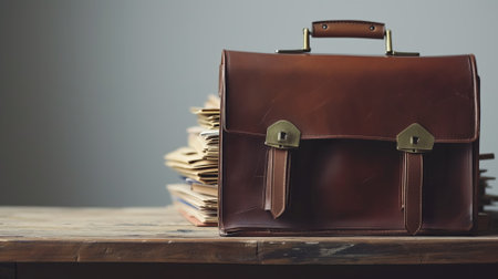 A detailed image features a brown leather briefcase placed on a polished wooden surface. The briefcase is the focal point, with visible stitching and brass clasps. Adjacent to it, a notebook and pen are present. The lighting suggests an indoor setting, and the composition is well-suited for professional and commercial applications.