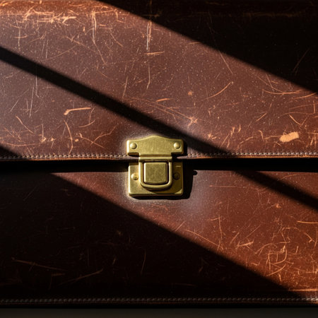 A close-up showcasing a vintage leather briefcase with precise stitching and a sleek silver clasp, emphasizing artisanal craftsmanship and refined elegance.