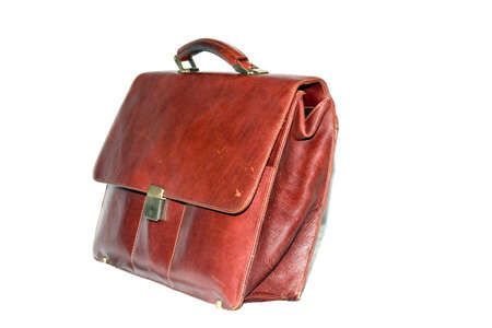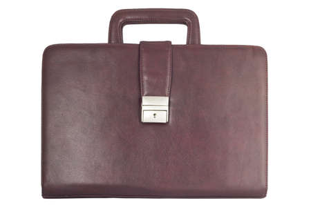 brown genuine leather briefcase with metal clasps, insulated on a white background
