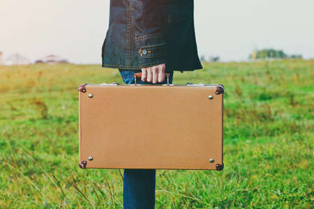 leather retro suitcase on a blurred background of nature / warm time for travel
